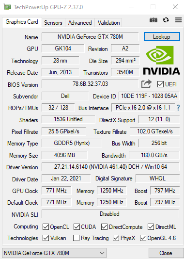 While testing my 780M card on Windows 10, I noticed Nvidia decided to drop support for Mobile GeForce cards after driver version 425.31 (dated april 2019), which is the latest version you can download and install from Nvidia website. Any newer version will tell you no compatible hardware is found and refuse to install.