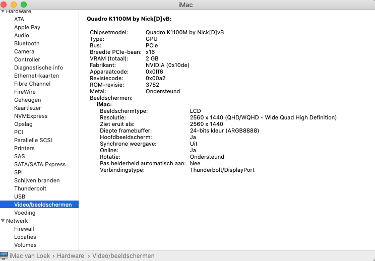 After hours of swapping SSD's with HS/ Catalina, swapping GPU for an original one I figured out that somehow my output is mapped to the displayport/Thunderbolt, see image. this is why I get a black screen on my mac,but ofcourse an external screen works. Doing a PRAM reset allows me to get in normally, but restart is black over again.