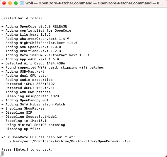 Code:- Adding OpenCore v0.6.8 RELEASE - Adding config.plist for OpenCore - Adding Lilu.kext 1.5.2 - Adding WhateverGreen.kext 1.4.9 - Adding NightShiftEnabler.kext 1.1.0 - Adding SMC-Spoof.kext 1.0.0 - Adding CPUFriend.kext 1.2.3 - Adding CatalinaBCM5701Ethernet.kext 1.0.1 - Adding AppleALC.kext 1.6.0 - Detected Wifi Card: 168C:002A - Adding IO80211HighSierra.kext 1.0.0 - Adding SSDT-CPBG.aml - Adding USB-Map.kext - Adding audio properties - No iGPU detected - Detected dGPU: 1002:67DF - Adding AMD DRM patches - Adding OpenCanopy GUI - Adding ExFatDxeLegacy.efi - Adding SATA Hibernation Patch - Enabling ShowPicker - Disabling SecureBootModel - Spoofing to iMacPro1,1 - Using Minimal SMBIOS patching - Cleaning up files