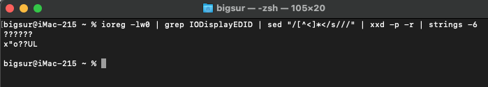 Code:$ ioreg -lw0 | grep IODisplayEDID | sed "/[^<]*</s///" |xxd -p -r | strings -6 $