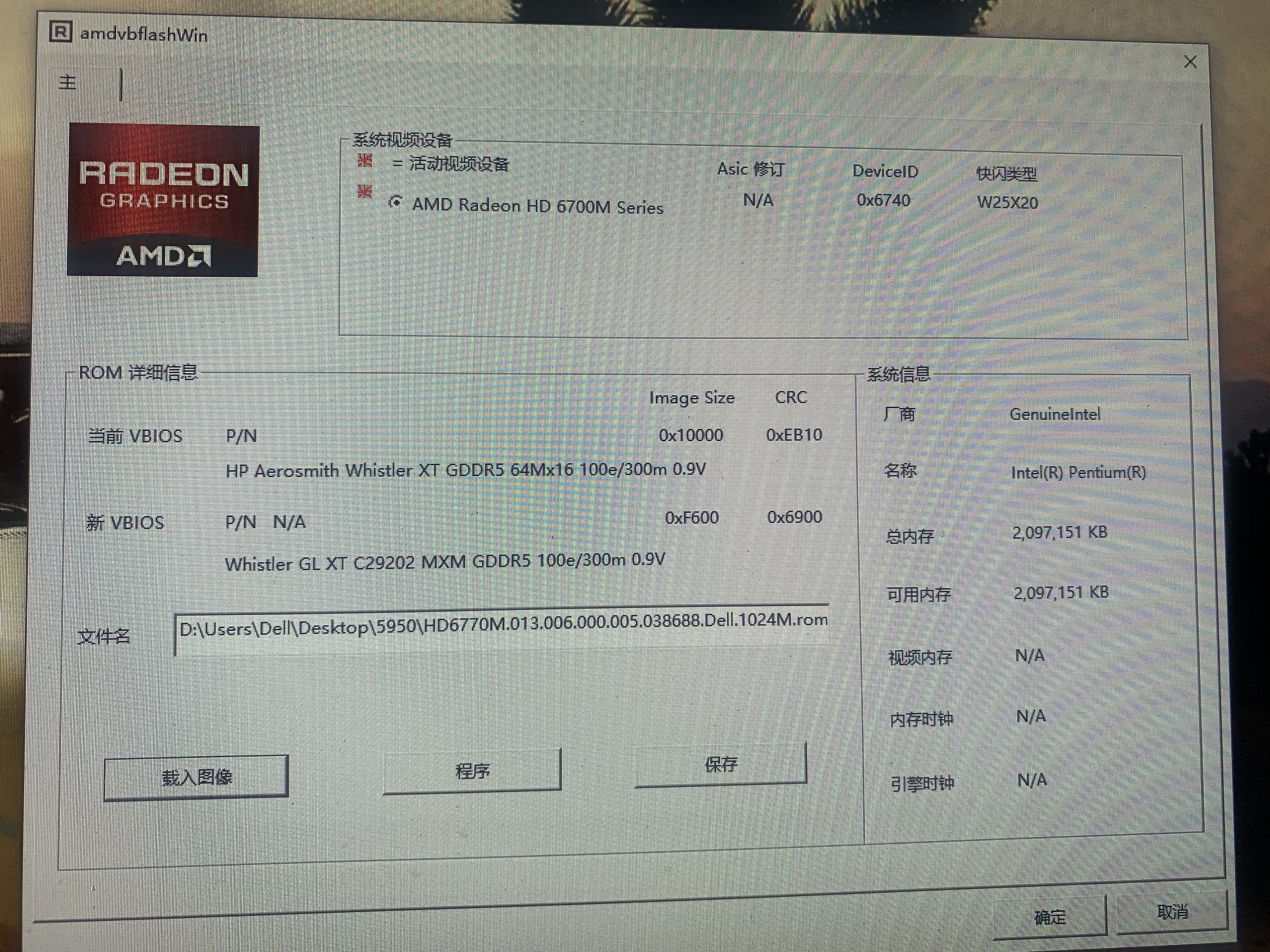 amdvbflash shows valid version and product name for the EEPROM contents - so I'd say that flashing has indeed been successful. It doesn't show anything for the new VBIOS you are flashing, but if I remember correctly that happens when old and new VBIOS have identical version and product name.Hi @internetzel Using amdvbflash graphics tool with CMD command to refresh Dell original M5950 HD6770M shows programming success, test GPU-Z tool shows VBiOS information is still blank no correct reading of VBiOS information written by programming. I guess it's still a hardware problem.