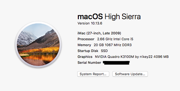Model: iMac11,1, BootROM 63.0.0.0.0, 4 processors, Intel Core i5, 2.66 GHz, 20 GB, SMC 1.54f36