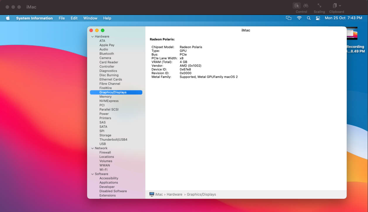 This card uses the AMD8000Controller.kext and the AMDBonaireGraphicsAcccelerator - RadeonX4000.kext which also natively runs in MacOS. The AMDMTLBronzeDriver is used to initialize its Metal capability. The default framebuffer is in use: RadeonFrameBuffer.