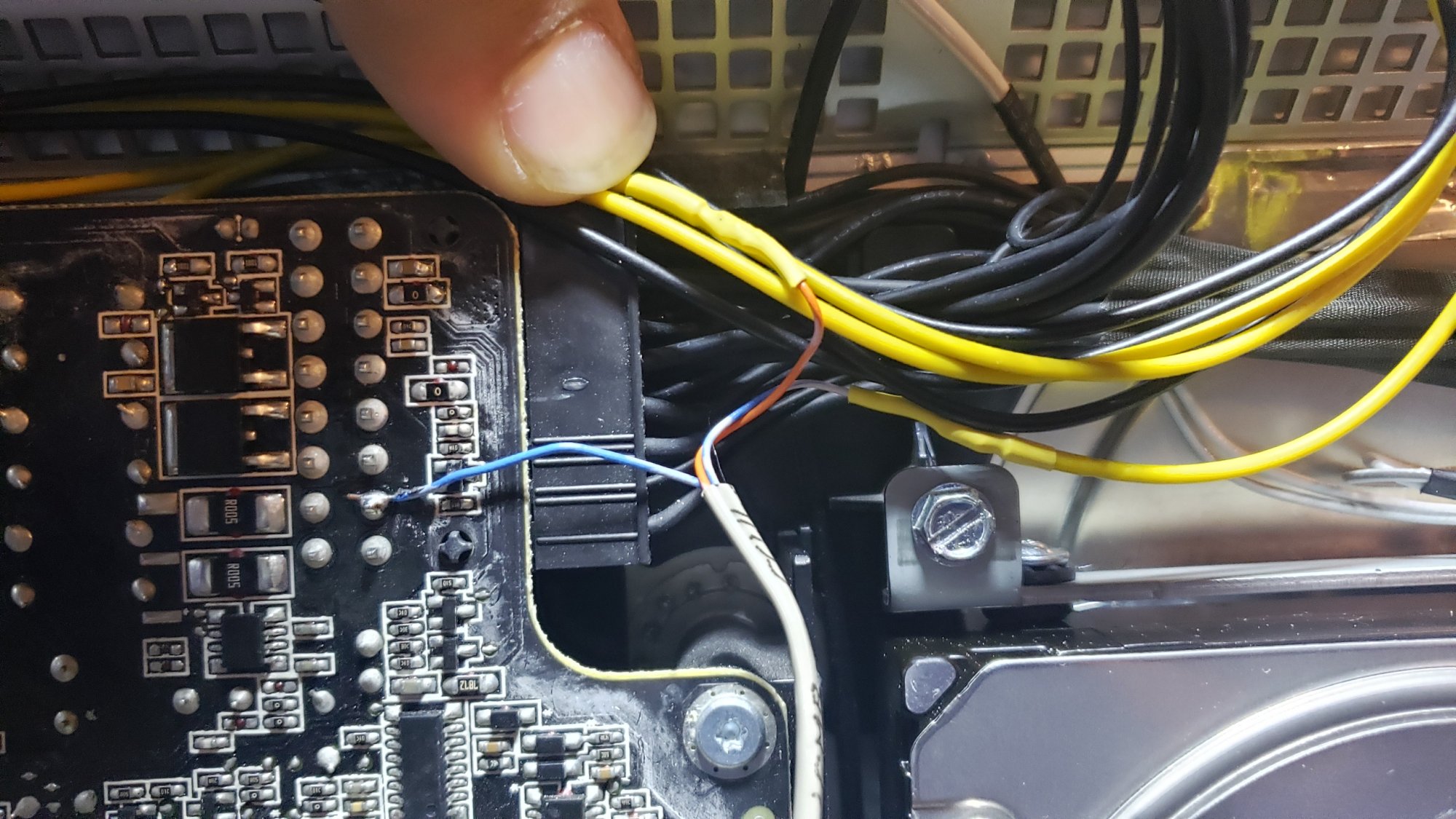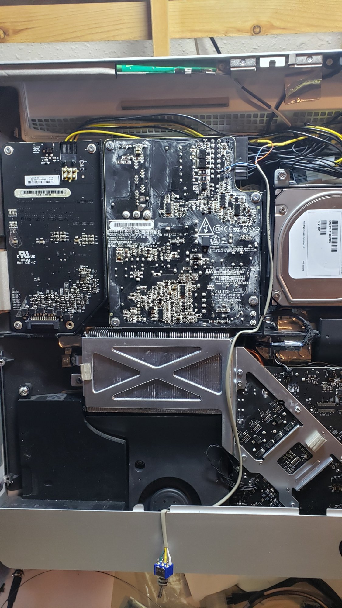 4.) Disassemble the iMac, remove the current Radeon HD card, replace it with the nVIDIA K1100M (also cut and change the wiring of the thermal sensors between the optical drive and the GPU heatsink). Reassemble the iMac, but leave all HDD/SSD disconnected.