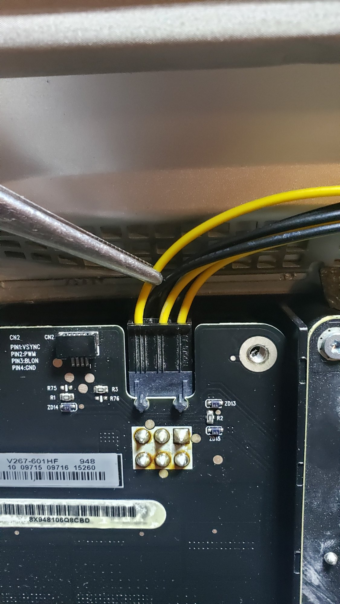 Step 4.5 Remove the iMac's LCD backlight power supply board, unplug the 6 pin cable that goes into it, and plug in the extension cable you just modified. Then plug the cable that used to plug into the backlight power board into the socket end of the modified extension cable. Tuck the cables so that they won't block the screen from sitting flush.