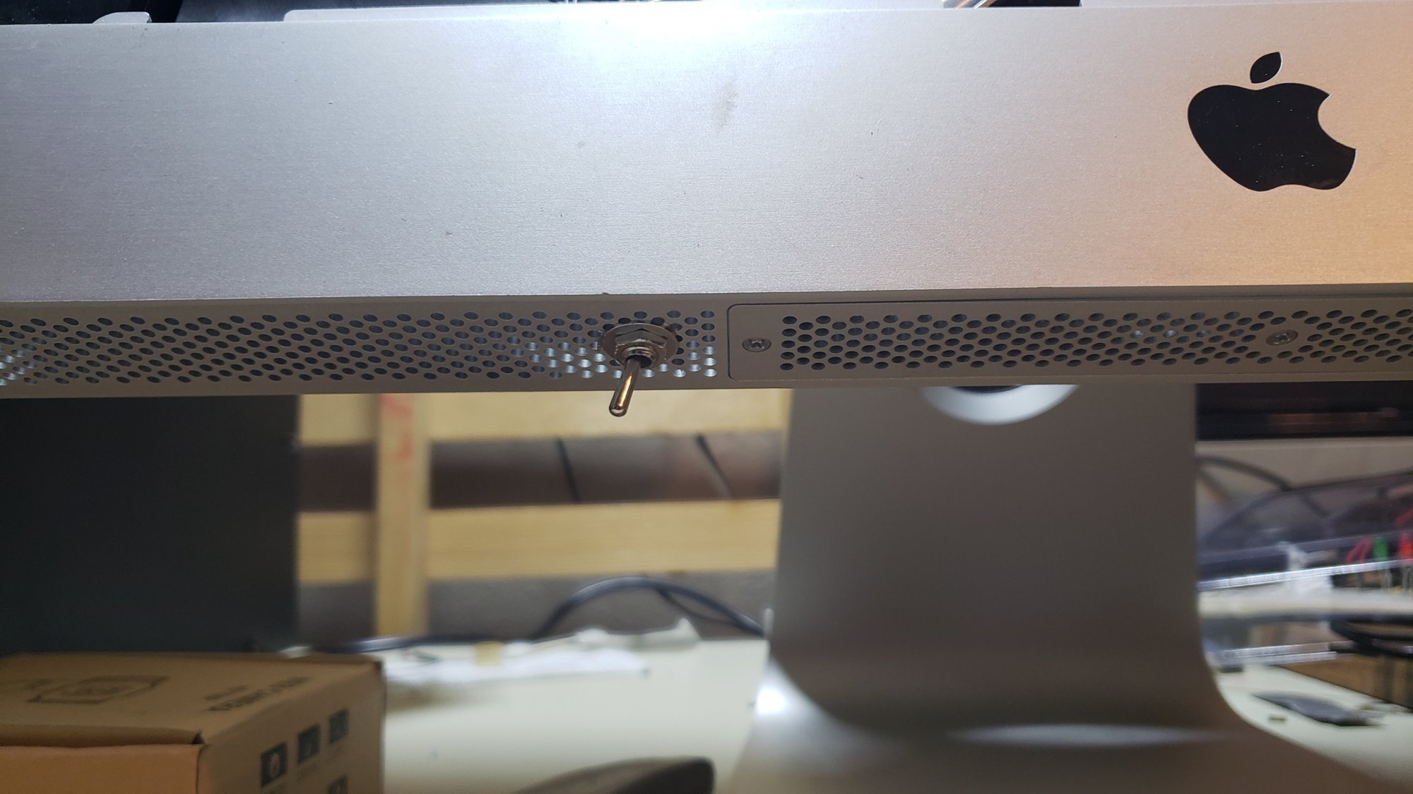 Step 4.6 (optional) you can drill a hole in the iMac's shell somewhere to mount the switch. This is easiest if you used a switch with a round post - so just drill a round hole and mount it through that. I made the hole in the bottom speaker grill, just to the left of the RAM card bay where there is a spot clear from the inside. Looks really neat IMO