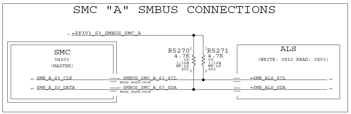 The SMC lines for data/clock use a write address of 0x52 and read of 0x53 for the "ALS", Ambient Light Sensor