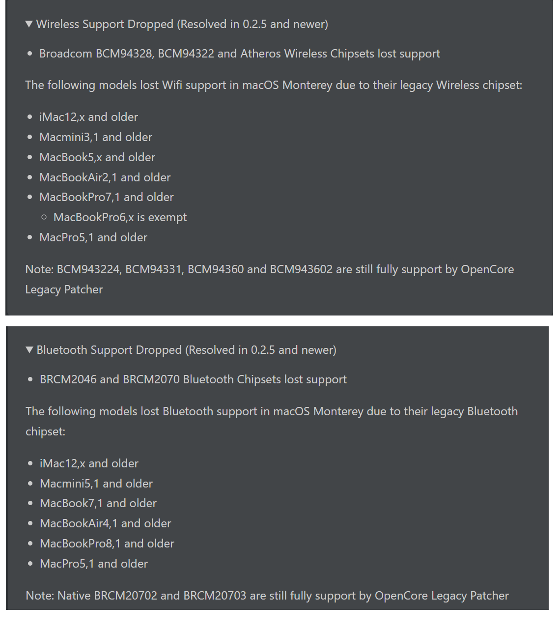 No, only basic functionality can be patched back (and it is not 100% stable).in opencore legacy: for wifi and bluetooth it is mentioned resolved "Resolved in 0.2.5 and newer"