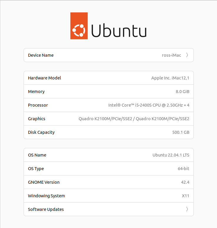 - Installed Ubuntu 22.04.1 LTS on to a secondary partition on my main boot drive. Initially this was to be able to ssh into my Mac in case of the blank screen issue.