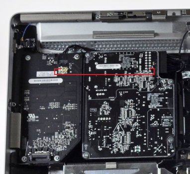 A different solution has been described several times now and last week and was in the mood to reopen my iMacs again and did this simple mod. The ODD fan is controlled both the the internal GPU temp sensor and the ODD temp sensor. Since we cannot heat up the ODD when the GPU is under stress, we just need to put the ODD sensor on a hot place: The GPU Heat sink!
