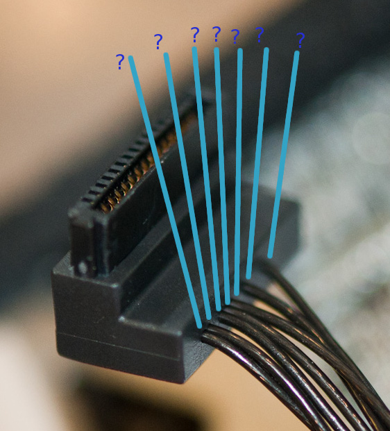 There are 7 wires on the Apple hdd cable and 4 wires on the SATA splitter - which wires went where? Not sure of the wire/pin layout on the Apple hdd cable - which wire/pin is 5v, etc.