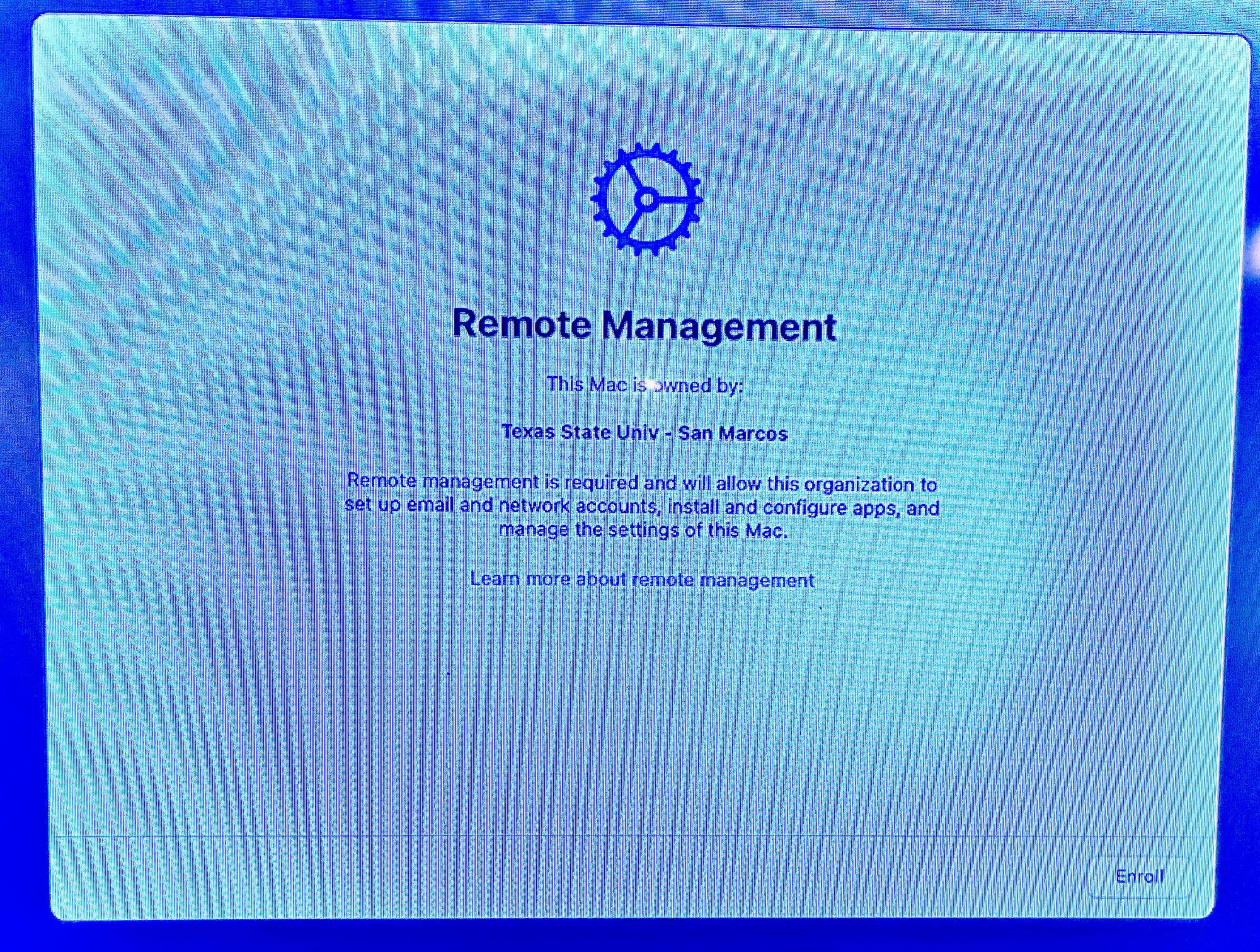 I have a 2012 Mac Pro 5,1 64 Gigs RAM, dual 3.46 GHz, & Radeon RX580 GPU. I had Monterey installed and it was working fine. Then I decided to install OCLP 2.1.2 and Sonoma, then I got this screen/page saying my Mac Pro was owned by Texas State University asking to enroll, and I couldn't go any further. I reached out to their IT dept and they were willing to help but could not find my machine. They said that they no longer use that system and maybe my Mac Pro wasn't cleaned of that MDM.