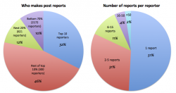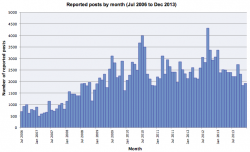 3103 members reported posts in 2013. Of these members, 51% reported just one post, while 90% made 10 or fewer reports each. The top 10% of reporters made 78% of all reports, with the top ten reporters alone making 32% of all reports - an average of 932 each.