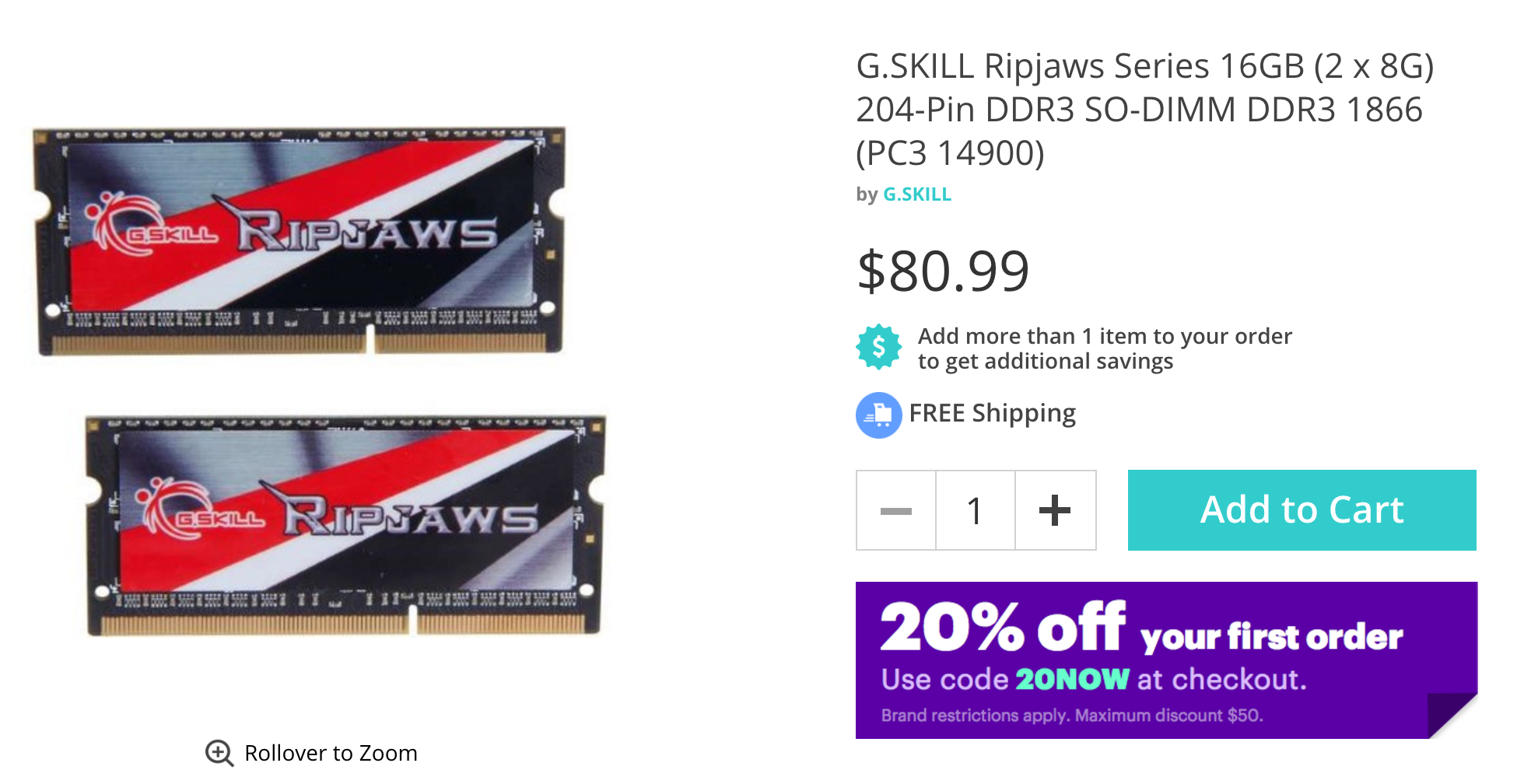 This is a really great deal on iMac compatible memory I found that I couldn't not share. 1866Mhz, 2x8GB, DDR3L (1.35v). Its G.SKILL Ripjaws Series if you care about brand. The deal is through Jet.com which some may have heard bad things about but I've ordered an SSD through them before and the purchase experience was fine. Here is how to get the discount: