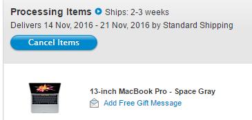 Hahaha, and all that ridiculous "call Apple and get your shipping upgraded" nonsense comes crashing down in pile of burning futility.Just got email from apple about next day shipping is not possible and they refunded shipping fee deliver date satyed same 15-22nov. Any one with macbook pro 13 in silver went Preparing for shipment