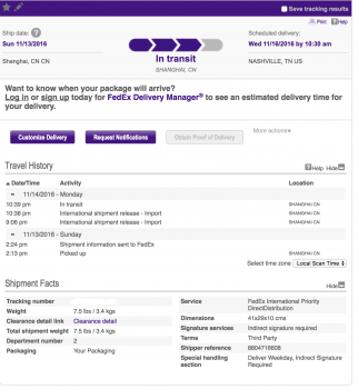 Mine (15" to east coast USA via FedEx international economy) has been stuck sitting at the local fedex facility in shanghai for a day and half now. Picked up by FedEx 10:26am 11/13 local time. No customs release or trip to the airport yet. Hope it still gets here this week