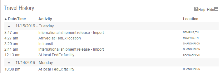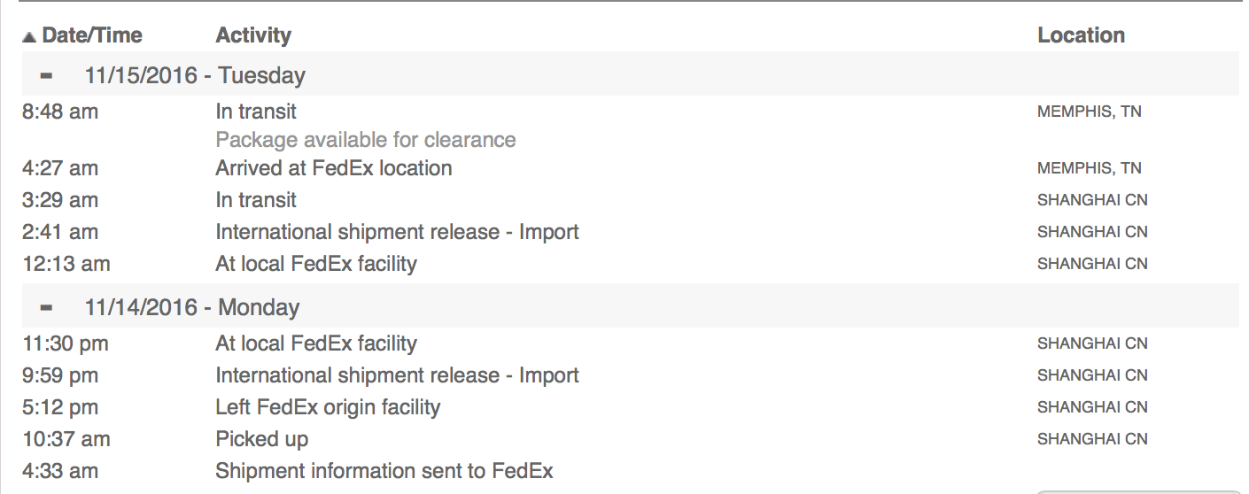 Same status! Do you think we will get our MacBook Pros tomorrow?My "shipped on november 13" tracking finally updated. Looks like it's shipping directly from the USA to Toronto area after arriving there yesterday. Makes sense but surprised as some other Canadians seem to have their shipment coming directly from China.