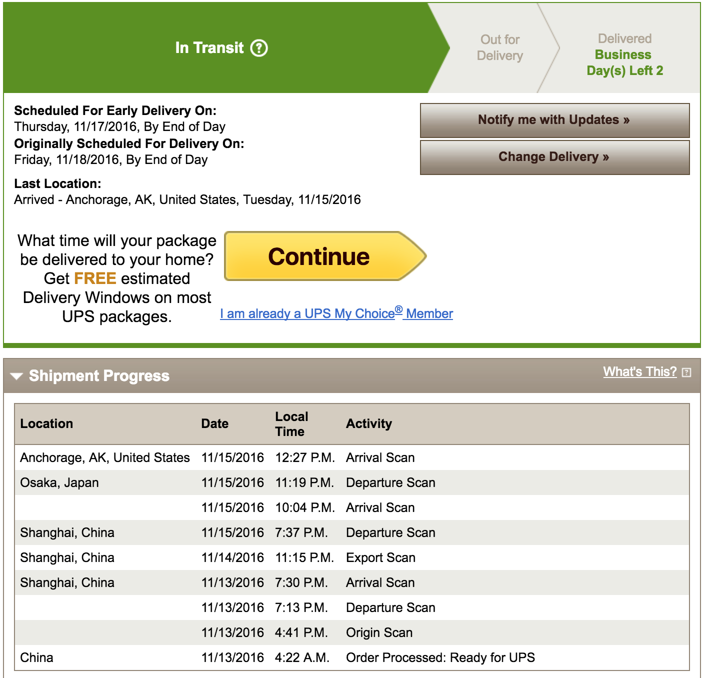 UPS just bumped up my delivery date to Thursday -- for the second time! (It had been Thursday upon the initial shipment notification, then changed to Friday once it was sitting in Shanghai, and now back to Thursday since it landed in Anchorage). Hope others that got pushed back to Friday have the same experience.
