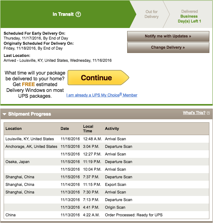 Mine arrived at Louisville within ten minutes of yours, and went through Japan and Alaska first, and we have the same original and updated delivery date. Although mine went through Narita, Japan, instead of Osaka, for some reason. But I assume we're in the same batch, as mine hasn't moved from Louisville either.Mine is "stuck" in Louisville KY now. Even though it arrived in time for the sort, it hasn't moved. I thought it odd that the delivery day was showing Thursday when usually I receive my packages the same day they arrive at UPS Worldport. Anyone else on the Shanghai -> Osaka -> Anchorage -> Louisville route that did keep moving overnight?