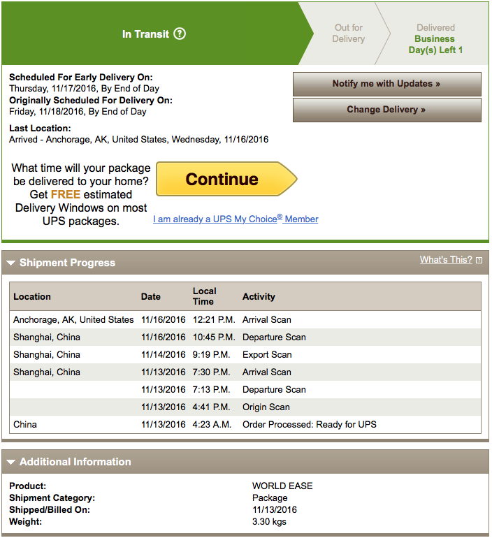 It actually arrived in Anchorage at 12:21! Delivery date now says tomorrow by end of day...I'll just be happy if it is here by Friday so that I can set it up over the weekend!It should be in Alaska tomorrow morning... At least that's where that hub from China usually goes through. Then to Kentucky. Hope this helps!