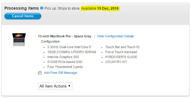 13" w/touchbar, 2.9GHz, 16GB, 512GB ordered 10/29 at around 9pm PST (I'm in California) is finally preparing for shipment as of 11/27!