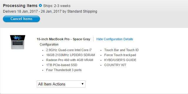 How long was it in the processing stage?Just wanted to give you all an update. I have had my MBP 15 460-512 for a little over a week now. I ordered 12/01 and delivered 12/23. Just a little over 3 weeks!