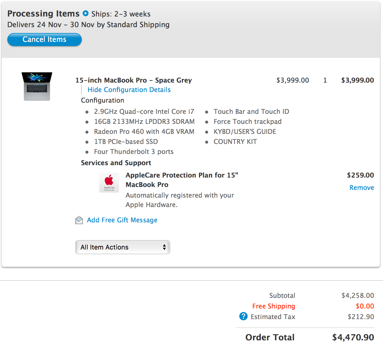 Had to cancel and reorder after forgetting the education discount the first time, but it didn't change my delivery date (although I'm cautiously hoping for an early delivery). This will ship just before my 2x cashback with Discover expires, so between that and educational pricing the cost isn't that bad. Upgrading from a base configuration mid-2013 13" MBA, which should translate to a very nice improvement.
