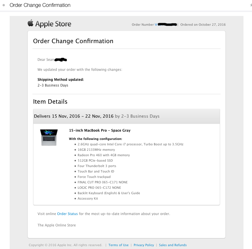 Congrats! My MBP15" to Spain stay in Dec 12 - Dec 15Hey guys. Weirdest thing just happened. So I decided to chat with Apple to see if they could expedite my shipping and they told me the usual - that the method they were using was already the expedited method. The guy was super nice and even told me he is waiting for his new MBP too. But then something unusual happened. I received an "Order Change Confirmation" email and my shipping was upgraded to 2-3 days. My delivery date moved up 2 days. It was Nov 17-25 before, now it says Nov 15-22. See the screenshot.View attachment 670093