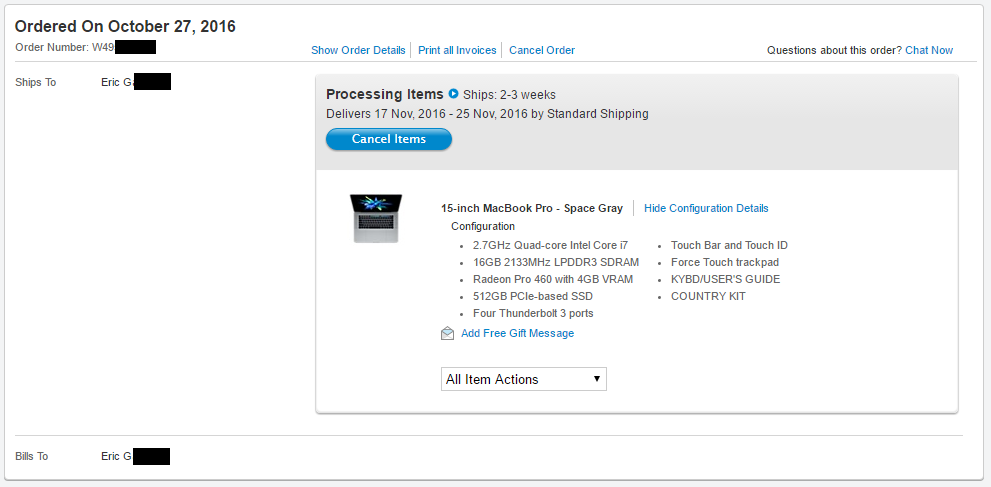 Mmmmm IHOP and Chick-Fila-A, great taste in food.My card got charged this morning! Of course Capital One flagged it as potentially being fraudulent. Hopefully it doesn't hold up anything. Mine is a BTO 15", ordered on the 27th around 5:47pm (because I cancelled my first order). Order Status is still on Processing Items though.