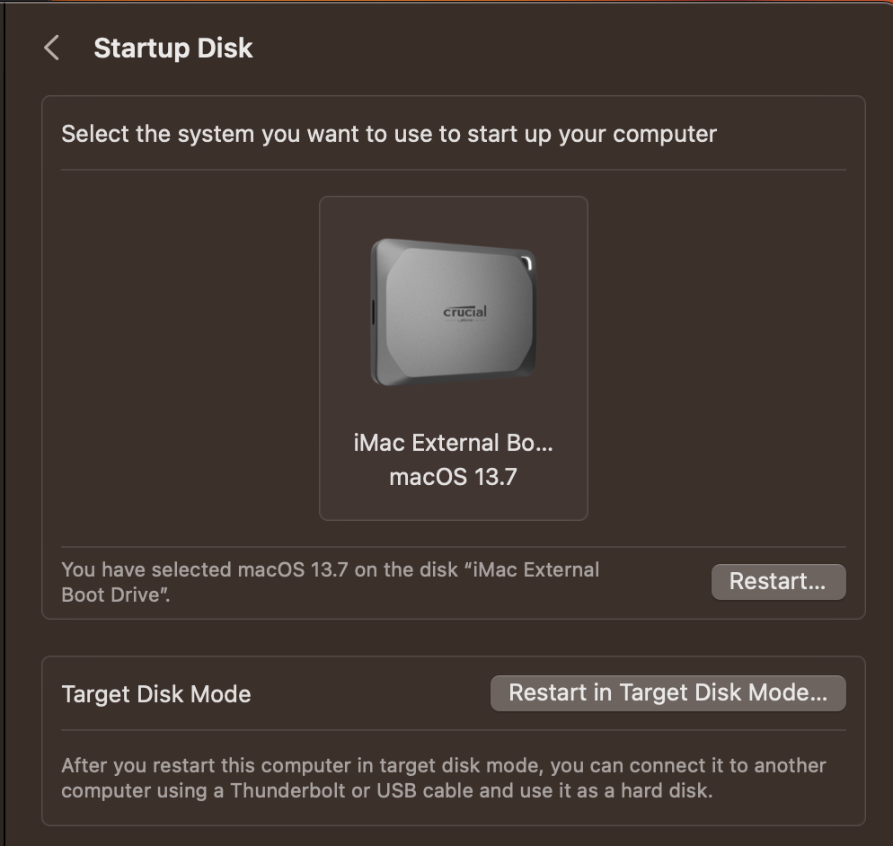 One option I thought would work is making sure that the external drive was selected in Settings -> General -> Startup Disk (see attached screenshot) but that doesn't seem to be honoured by the system. If left to its own devices, it will always try to boot from the Macintosh HD.