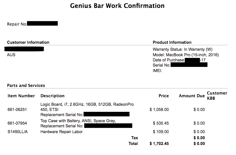 Here's the invoice Apple sent me for the repair work... Pretty outrageous for a machine I put in to fix a C key & spacebar huh?....Just lucky it was under warranty.... Oh and I was 40 cents out.. my bad...