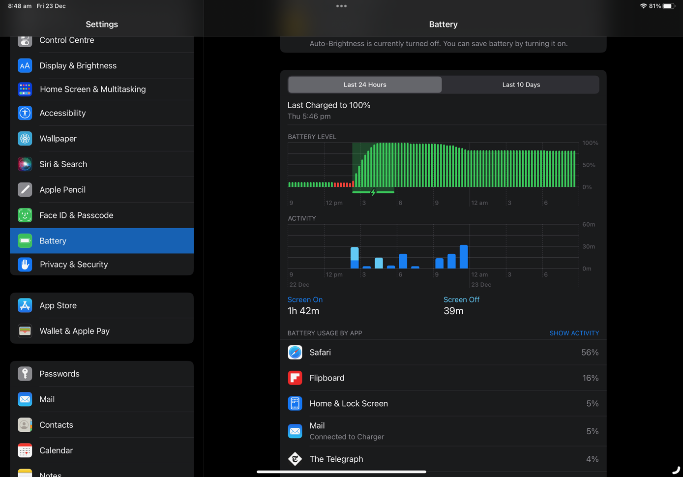 Recently I've noticed that I'm having to charge it more often than I used to. I charged it to 100% on Sunday evening. Since then Screen On time is less than 3 hours and the battery is down to 24%. Brightness is around 50%. Coconut Battery reckons the battery has had 475 cycles and is around 87% capacity.