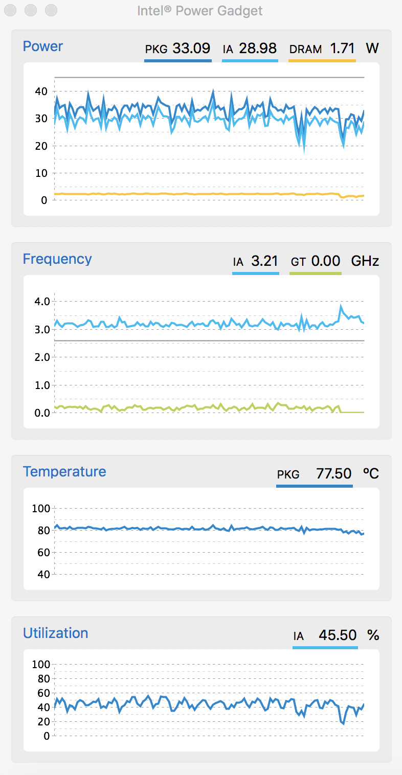 Apple's philosophy of removing all consumption limitations is clearly counterproductive for the current 2018 MacBook Pro systems. Even very short load periods of ~30 seconds result in massive clock fluctuations, which will affect the performance. We recommend the manual adjustment of the CPU consumption for both model, but the 15-inch MBP in particular. You still get the maximum Turbo Boost when a single core is stressed, and the performance is better and especially steadier under maximum load. We think Apple's engineers should have figured this out and a simple software update would solve the issue, but we know that the manufacturer from Cupertino does not like to admit these things (also see keyboard problems).
