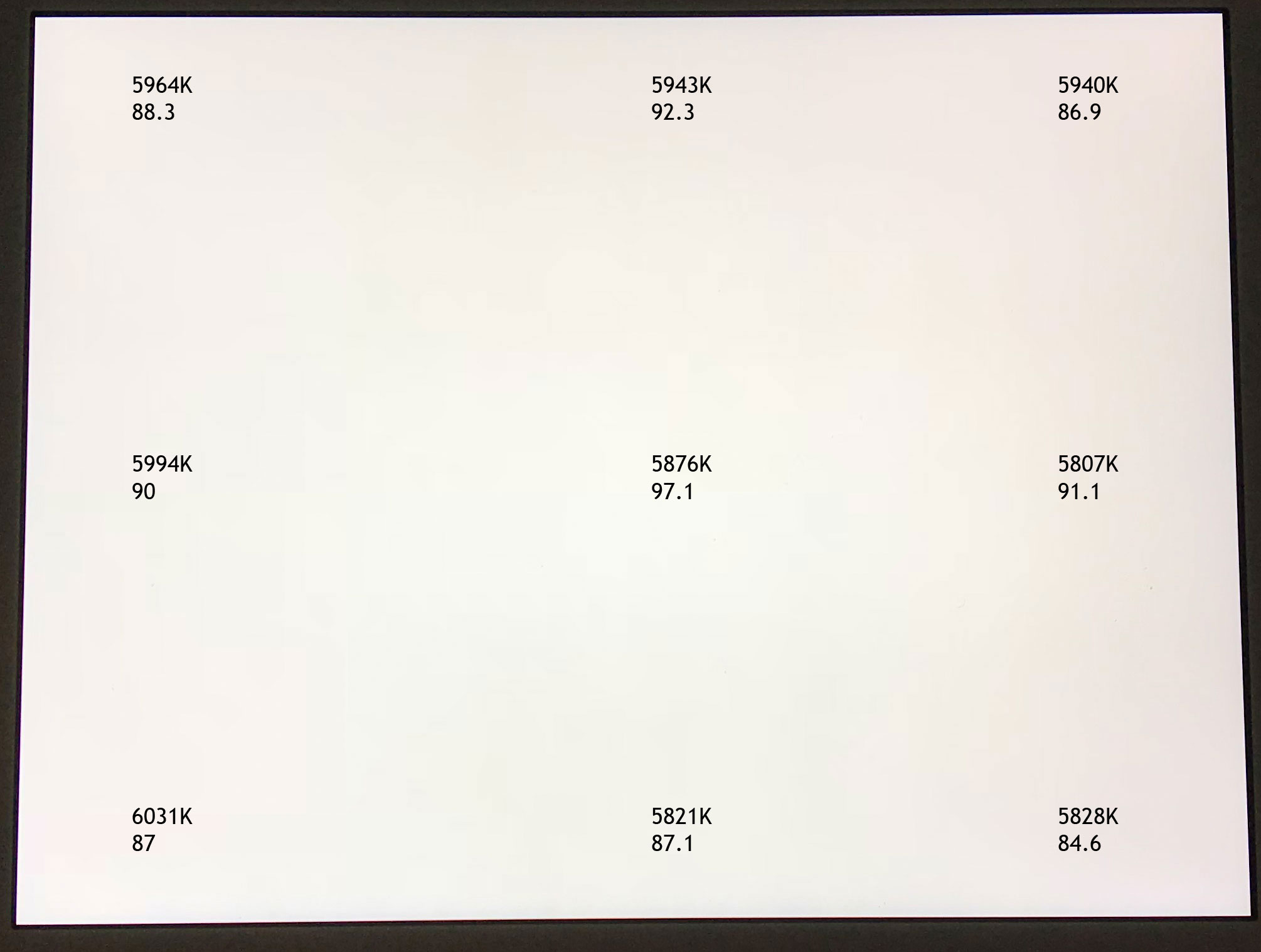 Those corner measurements are not takes as near the bezel as possible because it is hard to place colorimeter so near without taking accidently measurement from the bezel and usually displays are not meant to be measured those places anyway. I just quickly measured the visibly worst corner right next the bezel and it was about 150K warmer what the numbers edited on the photo are.