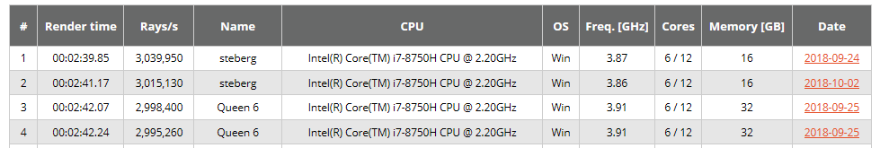 I also believe that given the significant gap with other 8750H CPU's there's a potential that our CPU's were binned down by Intel to meet production numbers as nobody else is remotely close. As for the MBP even the i9 is nowhere near close, the 8750H MBP is way down the list at 03:31.73 & 2,295,160 Ray's, given our notebooks are now passing 3,000,000 Ray's.