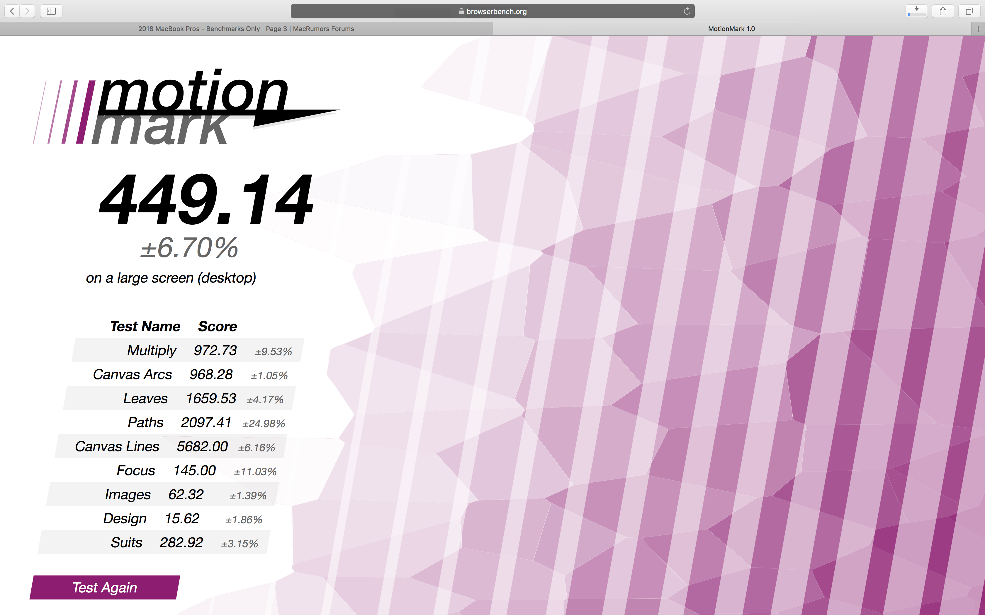 I just ran it with the same machine 13" i7/16/1TB and got a score of 449 ±6.70%