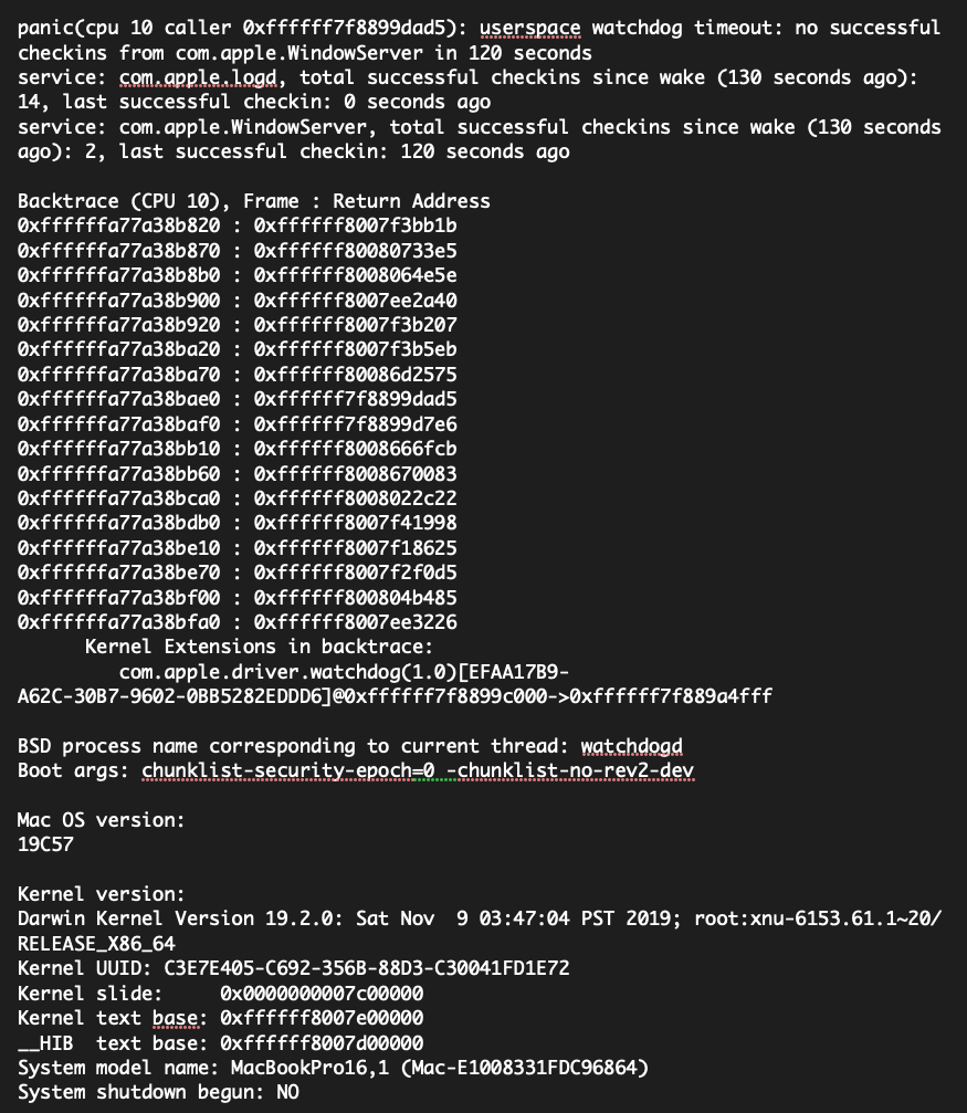 {"caused_by":"macos","macos_version":"Mac OS X 10.15.1 (19B88)","os_version":"Bridge OS 4.1 (17P1081)","macos_system_state":"running","incident_id":"78F474F1-0C35-479F-811D-1DA508C38A6E","timestamp":"2019-12-01 08:26:02.87 +0000","bug_type":"210"}