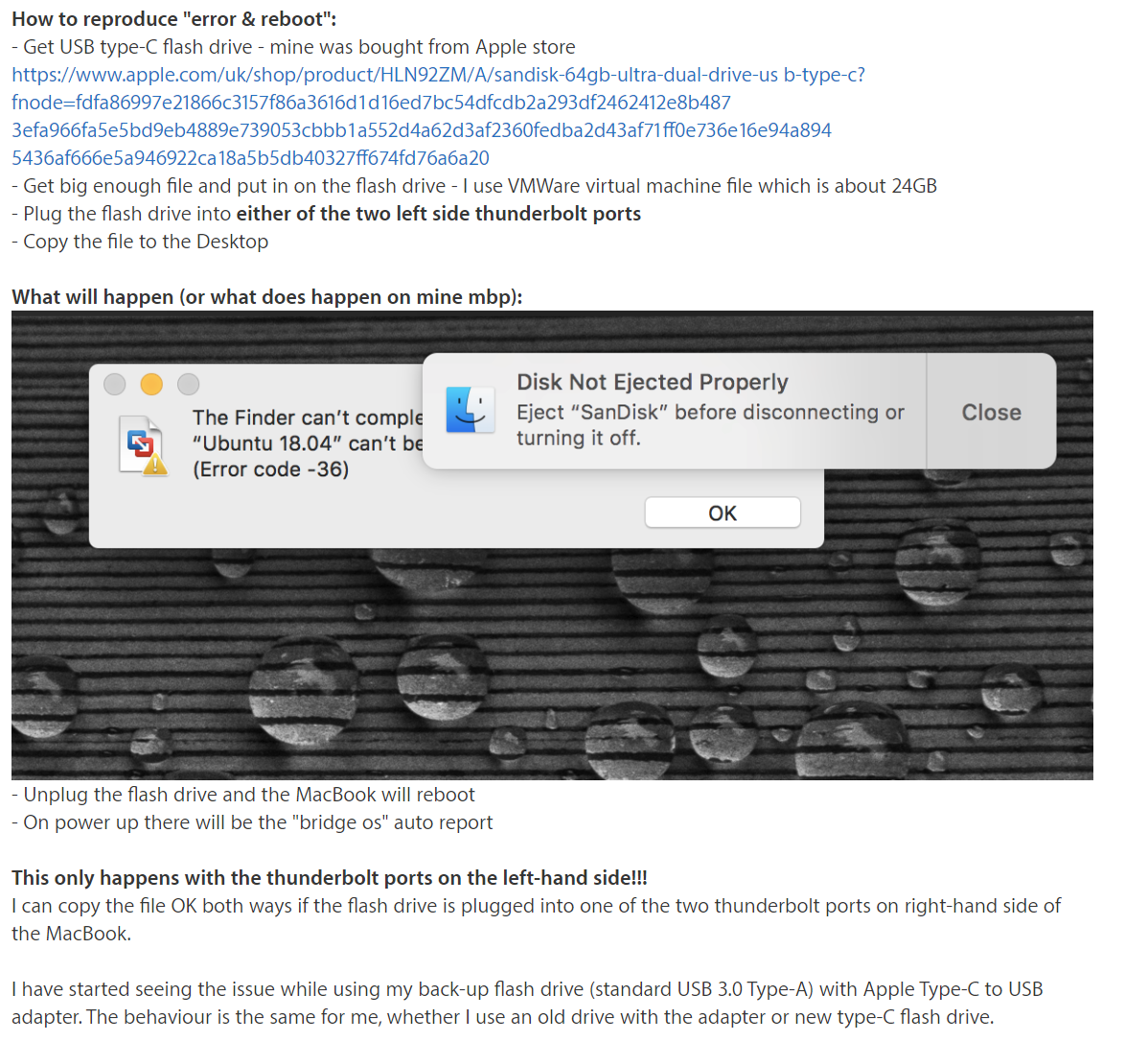As an amateur following this thread, Im beginning to think that those of us who are casual or light users such as web surfing, e-mail, texting, etc. aren't seeing the problem because we aren't stressing the device. Those who are professional users and are attaching all kinds of equipment are getting the crashes and when they get a replacement the same thing happens because their use hasn't changed. It would be unlikely for the majority to have no problem and a few to be unlucky enough to keep getting multiple machines with the same flaw. Unfortunately that may mean all 2018 MacBook Pros are affected.