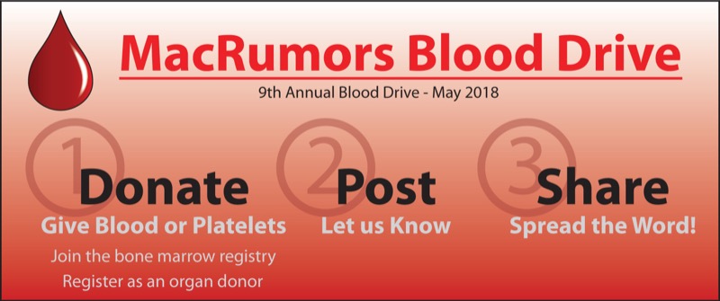 MacRumors is pleased to announce the Ninth Annual MacRumors Blood Drive, throughout the month of May 2018. Our goal is to save lives by increasing the number of life-saving blood and platelet donations. While most blood drives are specific to a geographic location, our blood drive is online and worldwide. MacRumors routinely reports on Apple's support for charity, as summarized in our Help Center. The MacRumors Blood Drive is our own community effort.