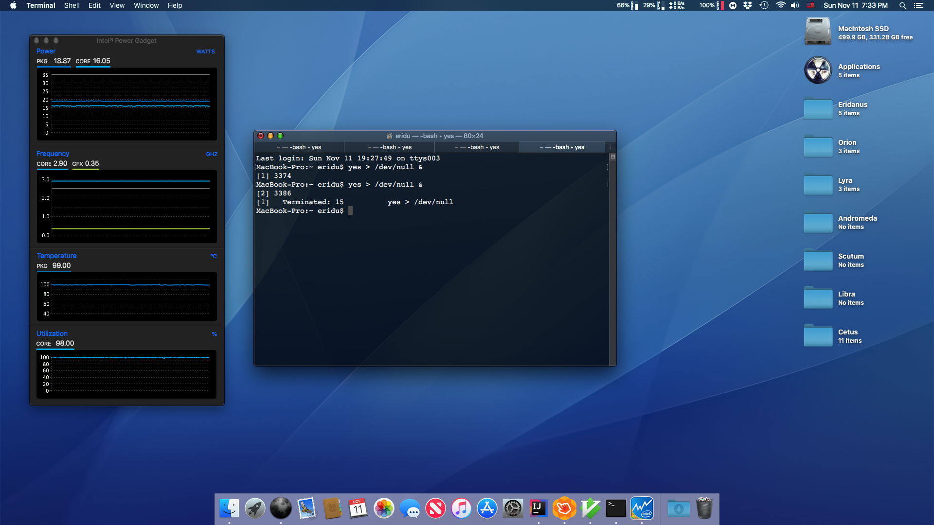 So, with that being said, at load this baby is getting up to a peak of 100C, though it floats around 92-96 at load. This is using both Mac Fan control and Intel Power Gadget