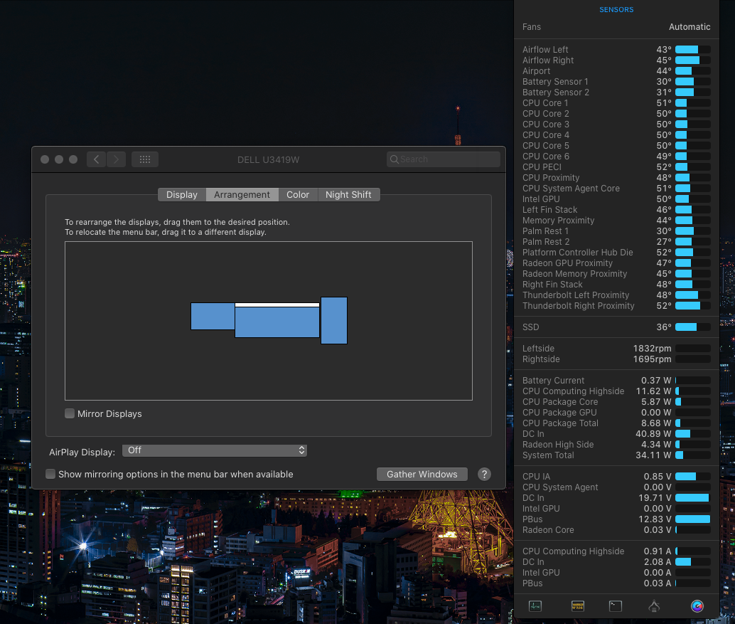 All three monitors perform fluently, scrolling and Mission Control rarely drop a frame, even with tons of windows and Spaces. This wasn't the case without the eGPU and 3 monitors, one being a 5k. I've used to the iPad Pro smoothness and appreciate when a docked MacBook gives a similar experience, though not at 120 Hz.