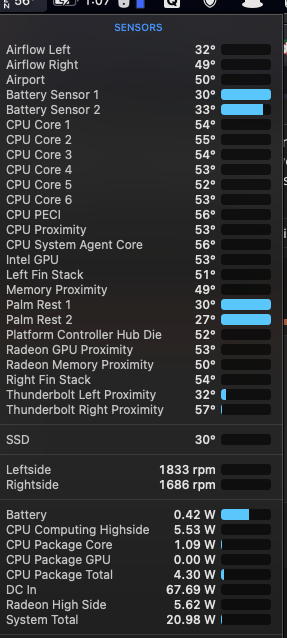 1) The VRM chips on the 16 inch MacBook Pro are quite terrible (lack any active cooling) & barely manage around 55W of sustained power supply to CPU&GPU. By sustained, I mean after running for more than 20 minutes. With only the internal display, if you run any intense workload that maxes both the CPU & GPU, the VRM chips can supply as high as 120W of total power (battery+adapter) at the start. However, after a few minutes the VRM chips overheat and the 16" MBP prioritizes the GPU. This means the CPU can get throttled to as low as 0.8 GHz. However, this by itself is not an issue for most people as most don't max out the CPU & GPU at the same time. But...this is why the Thermal Pad mod can dramatically improve performance by letting the VRM chips sustain as high as 80-85W of Power.