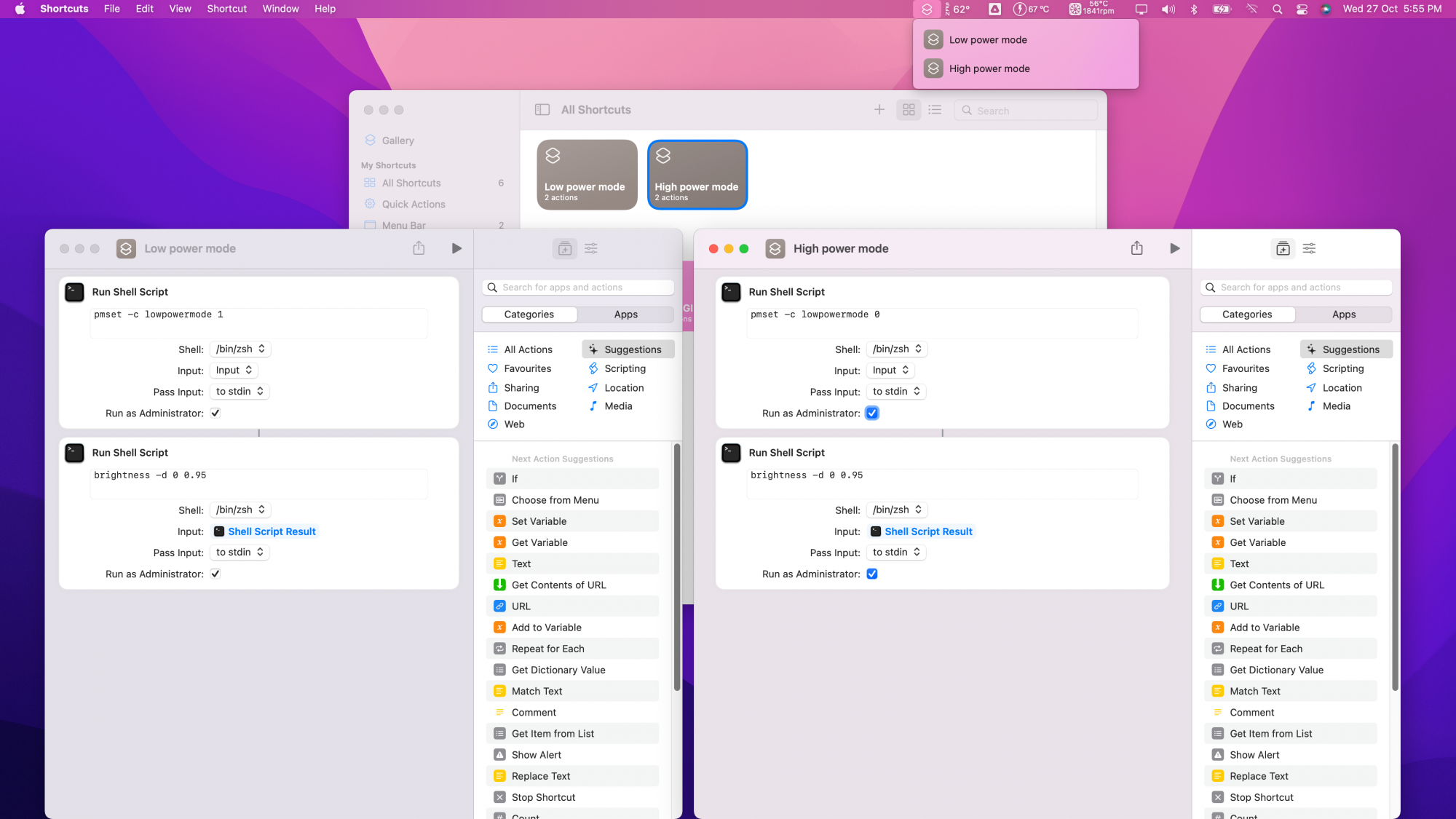 Unfortunate MacOs automation is not supported.I created two quick shortcut to quickly switch between power modes and keep the screen brightness unchanged.