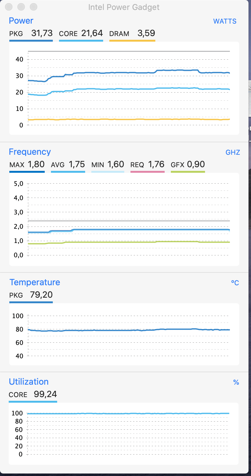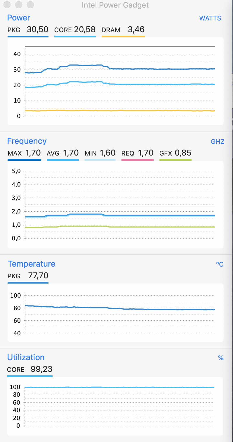 Every time I started with Luxmark - selected stress test and verified that GPU power is jumping to approx 60W+, then I started Cinebench 20 and started intel power gadget.