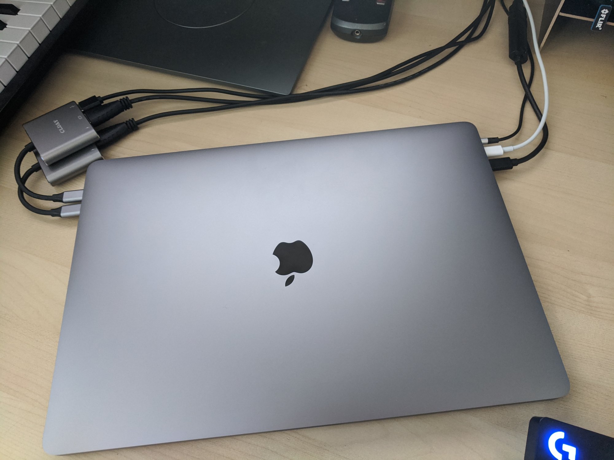 (2 x 1440p@60hz + a USB keyboard on the left side, 1080p@60hz + Apple charger on the right side)