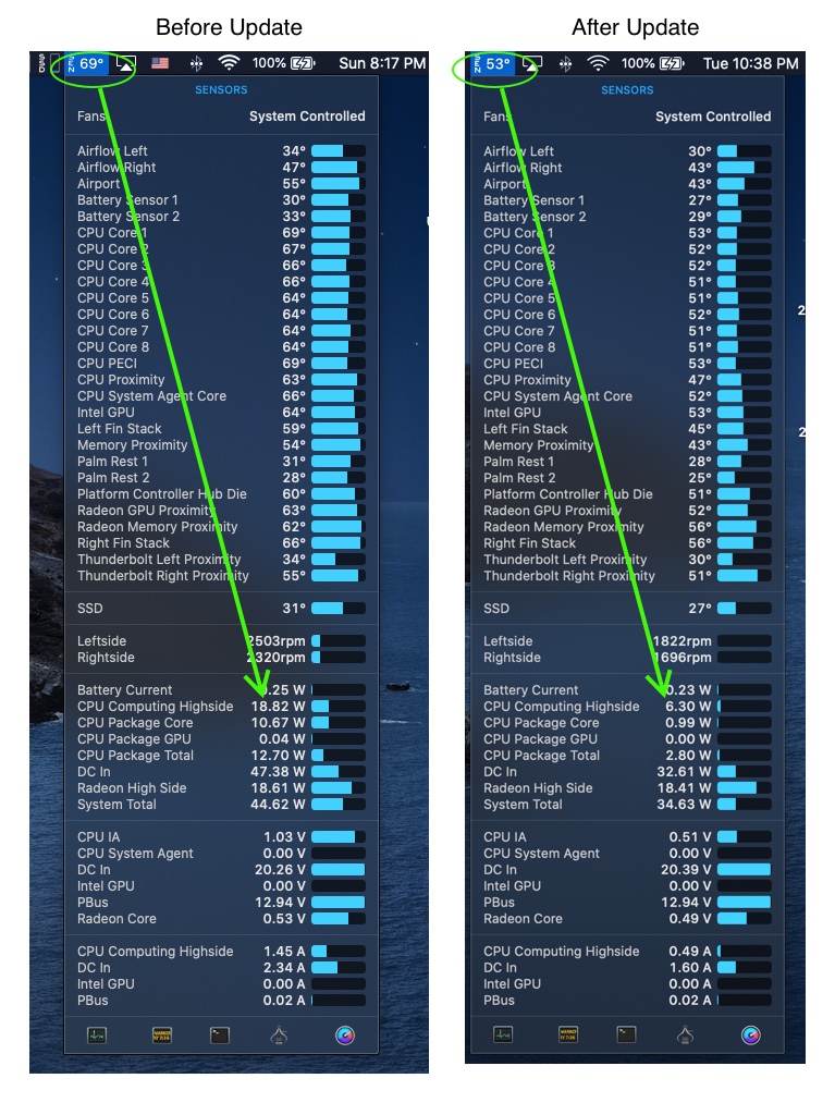 Would be interested to know how the cpu speed differs between these two - I wonder if they’re making the cpu run slower to keep the heat in check with the external connected, because the Radeon issue simply can not be fixed?Did Apple change something just now? I got an alert for a supplemental update, 10.15.5 or something. Said it was for security and recommended for all users. Sorry wish I took a screenshot of it. But now with the monitor plugged in, my CPU highside went from 18W to 6W or lower. (Radeon still high though) Idle my temps are reading around 50C. Which they where 60C+ before update. I can still hit the low 60C mark pretty easy with Sketch, Notion, Outlook, Teams, Slack and a few Chrome tabs open to do it. Wishful thinking perhaps, but I'll keep an eye on it tomorrow through a full day of work. Thoughts? Anyone else do an update recently?View attachment 921154
