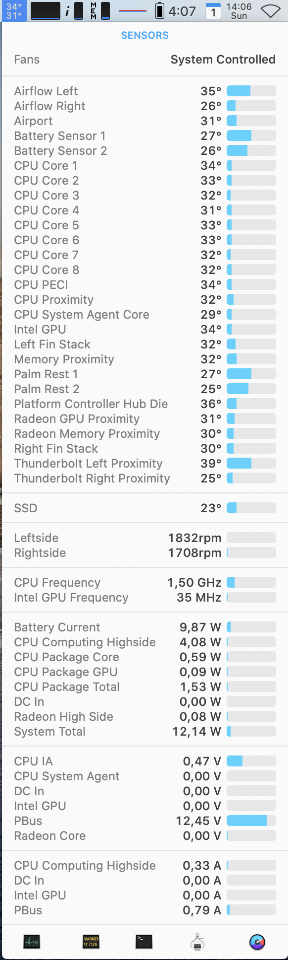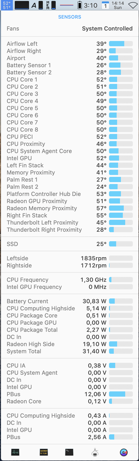 This is my 8 core 15" with a single youtube video running fullscreen at 1080p in Safari.Just for reference, with those configurations which seem to be pretty similar... what about light workloads? Like watching a 10-min YouTube video in fullscreen, does CPU/GPU ramp the fans up while scaling all those pixels to 5k and back down to 4k? Not talking about 4K videos trough Chrome (which I know are a different beast because of VP9 encoding) but something like 1080p YT videos in Safari. Thanks in advance!