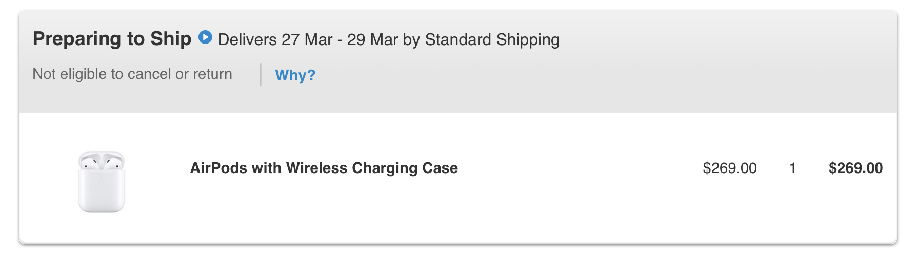 Ordered at 9:39 March 20th for a pair with wireless charging case, shipping to Montreal Canada. Still “Preparing for shipping”... Tried track by reference on UPS website, nothing found. Impatiently waiting...