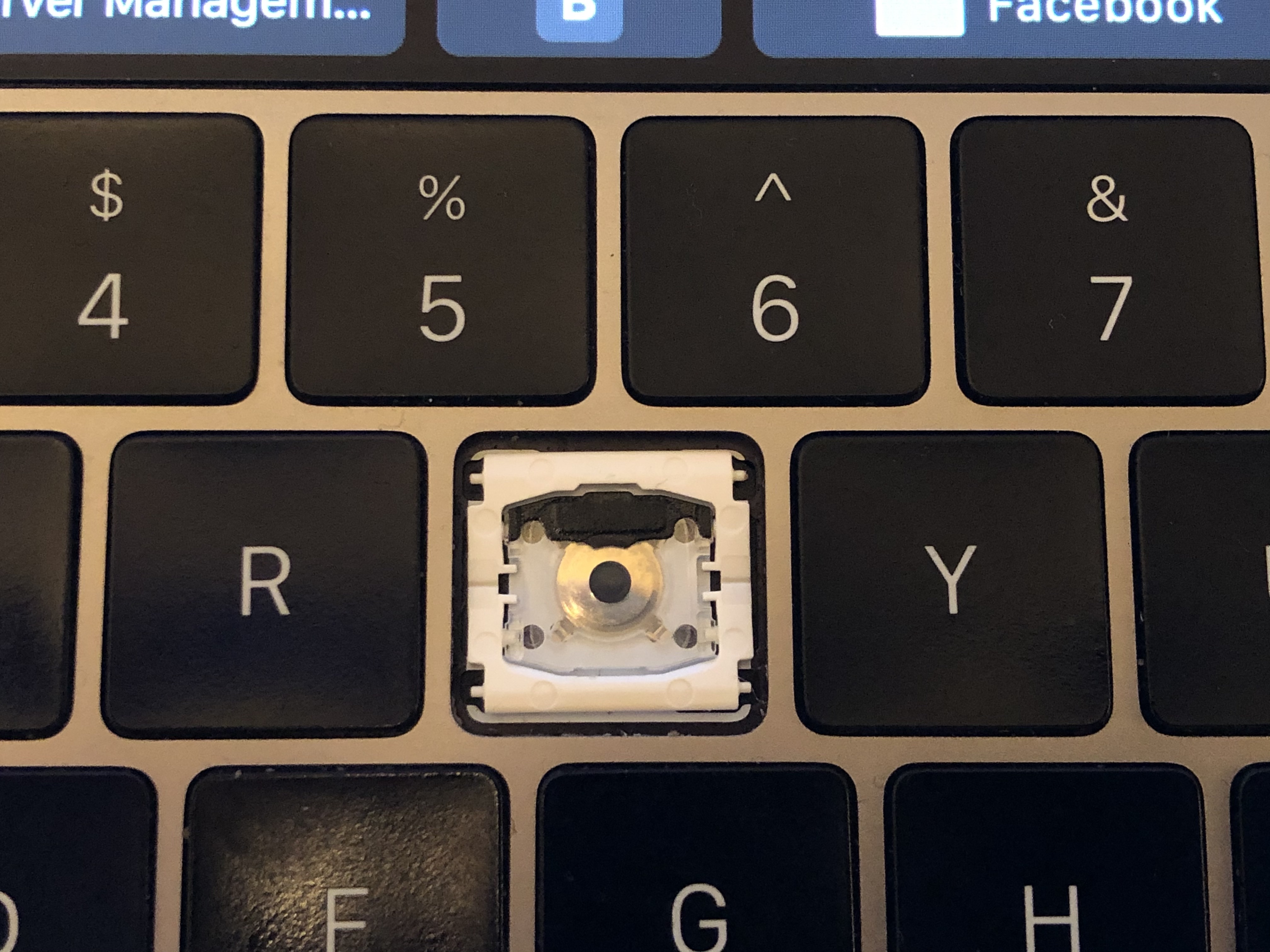 BTW, don't pry the keycaps up. If it lifts up when you gently try to lift it, then the keybinding between the keycap and the butterfly is broken and the keycap should be replaced. If you have one corner or side that appears to be sunken in and it's truly because the butterfly jammed, it's better to just give a firm press to try and get it to bounce back up. Prying it back up via the keycap is likely to damage it.