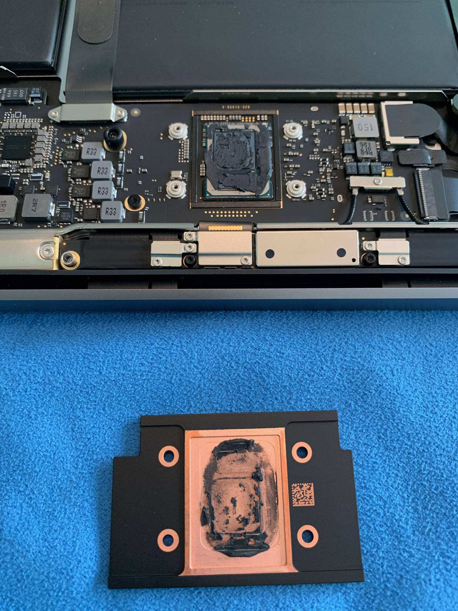 After I cleaned all the older paste and cleaned it with an approved alcohol cleaner on the inner heat sink and the CPU & GPU die, careful not to have excess liquid. I dampened my tips on a coffee filter.